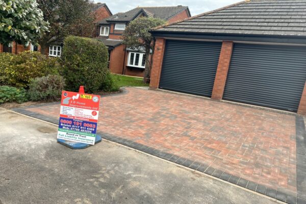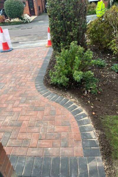 Old block paving driveway removed and new block paving driveway installed in Portishead, North Somerset. Constructed using Red Brindle blocks with charcoal border.