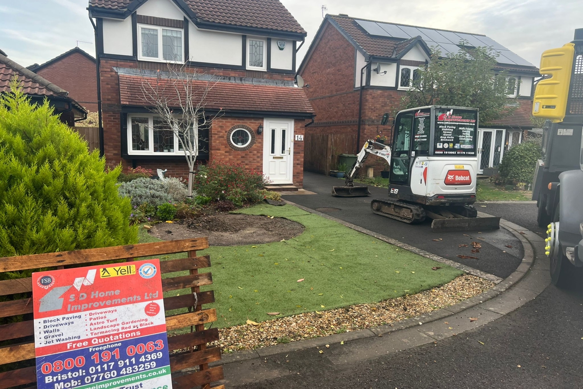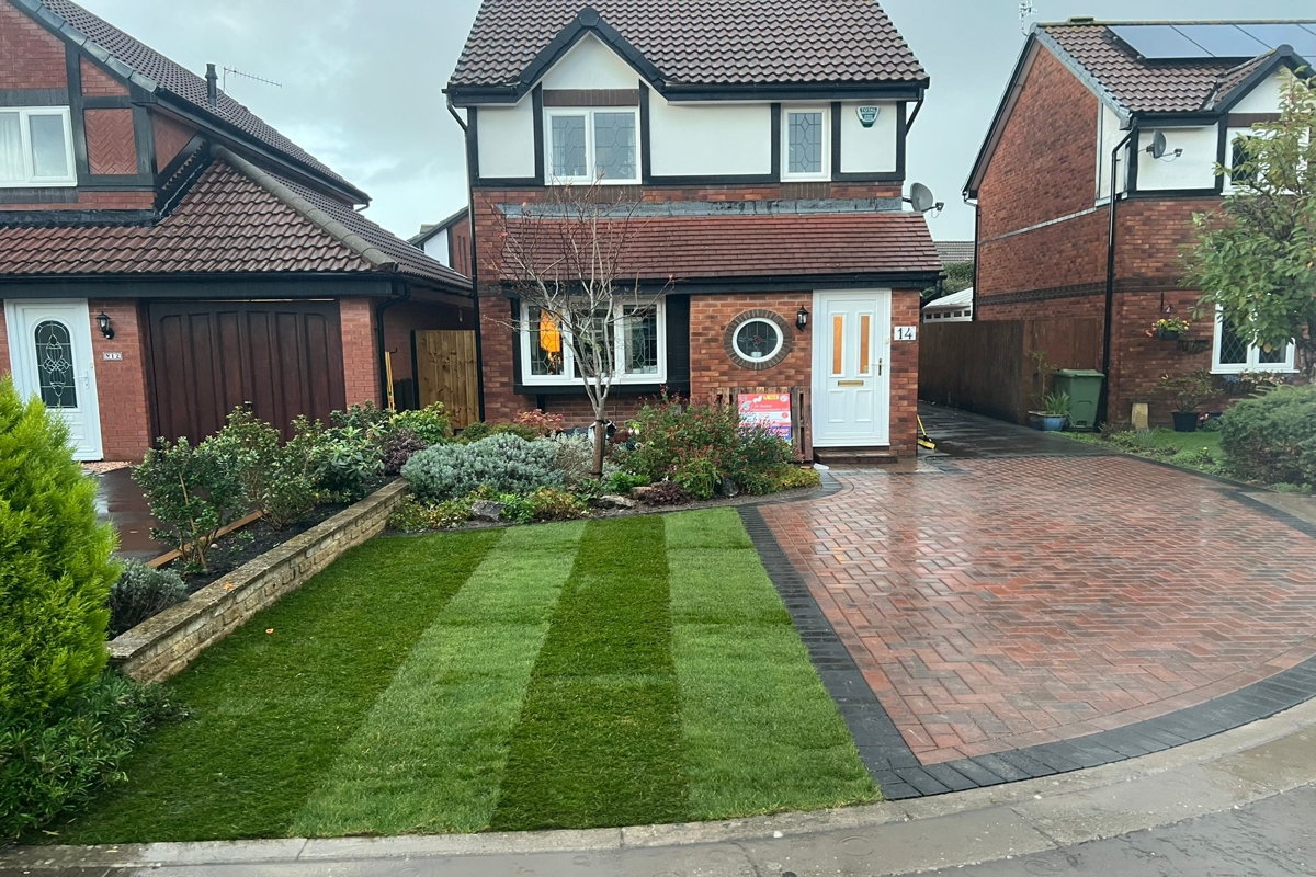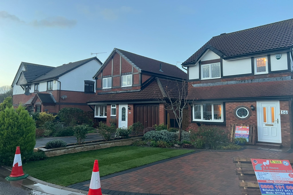 New block paving driveway and garden installation completed in Portishead, North Somerset. Driveway constructed with block paving, and garden area laid with grass.