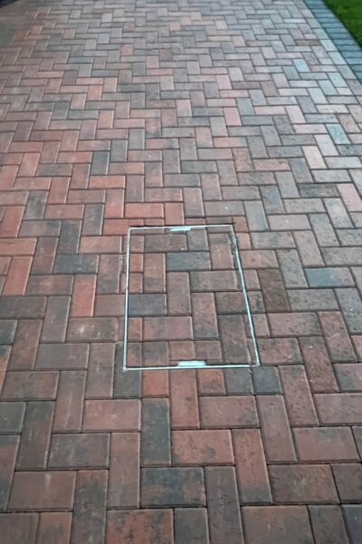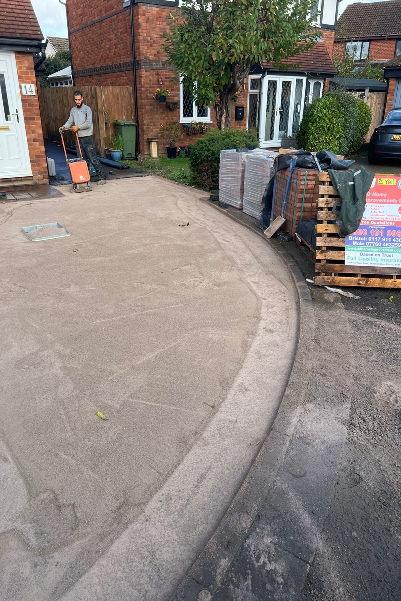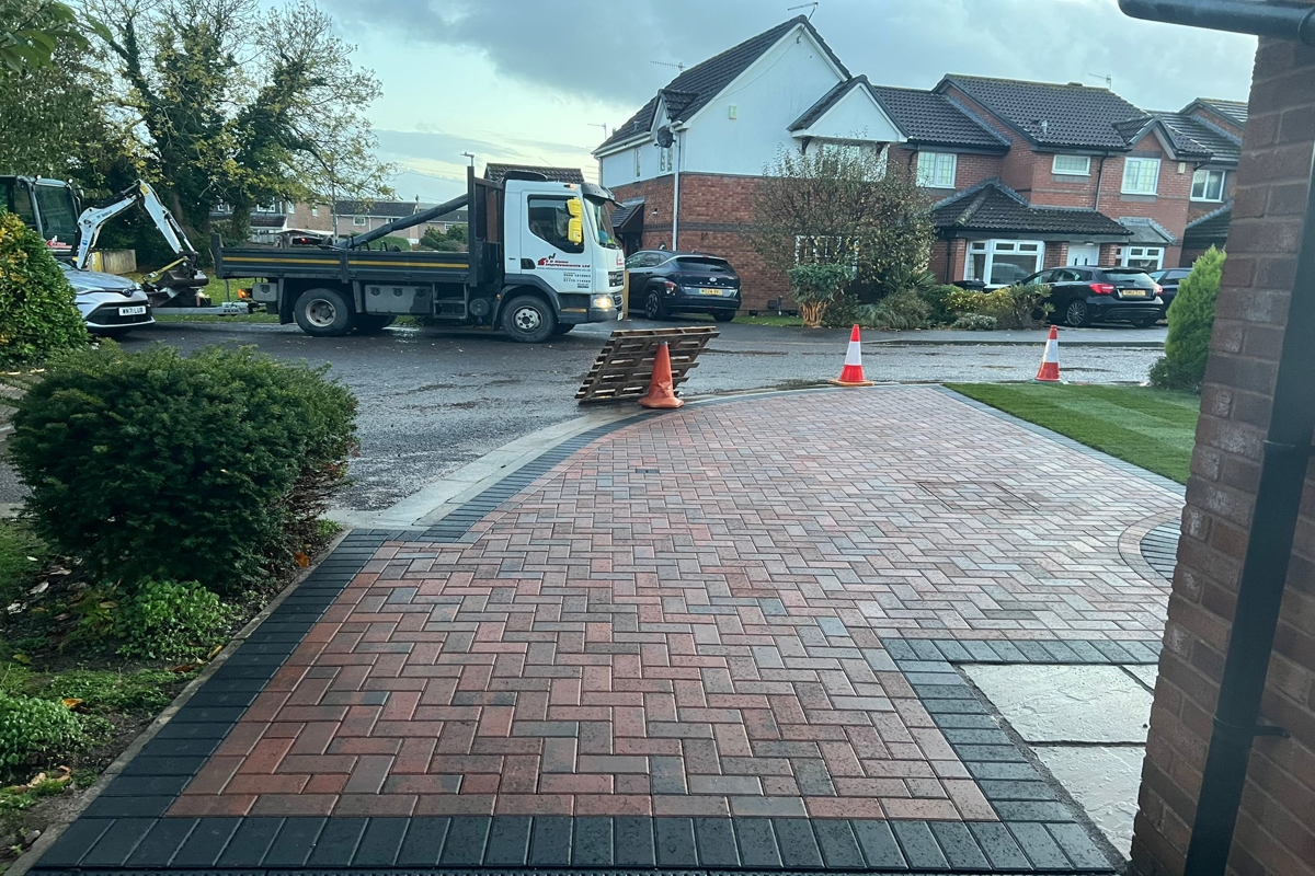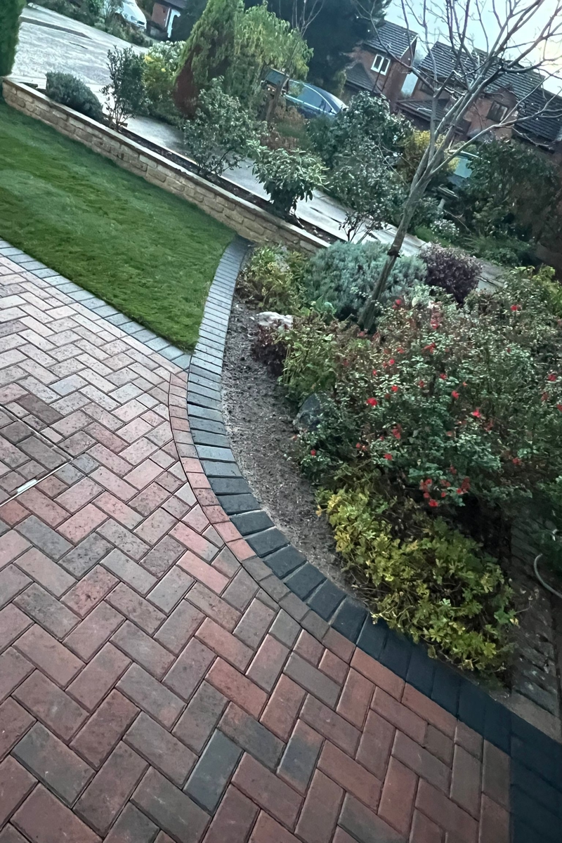 Supplied and installed a sand / grit base for laying paving, Installed paving on top of the sand, Laid the paving in a °90 degree herringbone pattern, The paving used was block paving, All open edges of paving set in concrete, Machine vibrated and compacted the paving