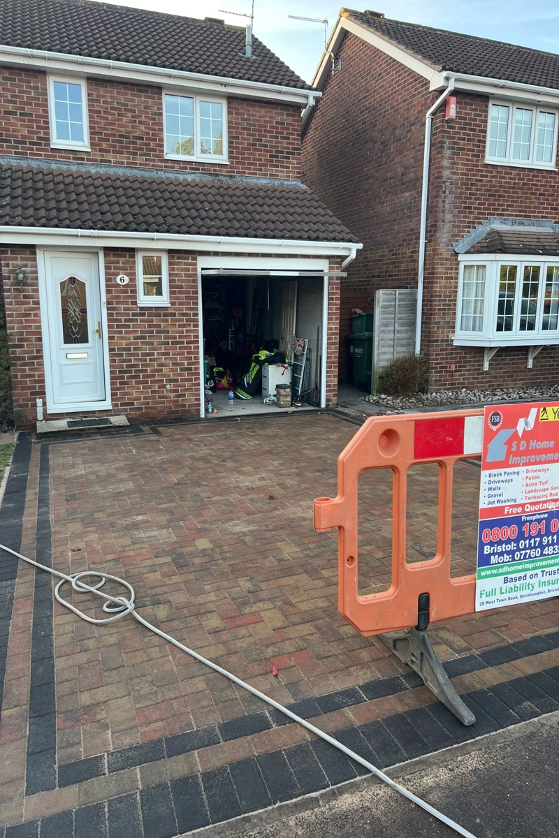 New block paving driveway installation completed in Downend, South Gloucestershire. Constructed using autumn mix blocks with a double charcoal border.