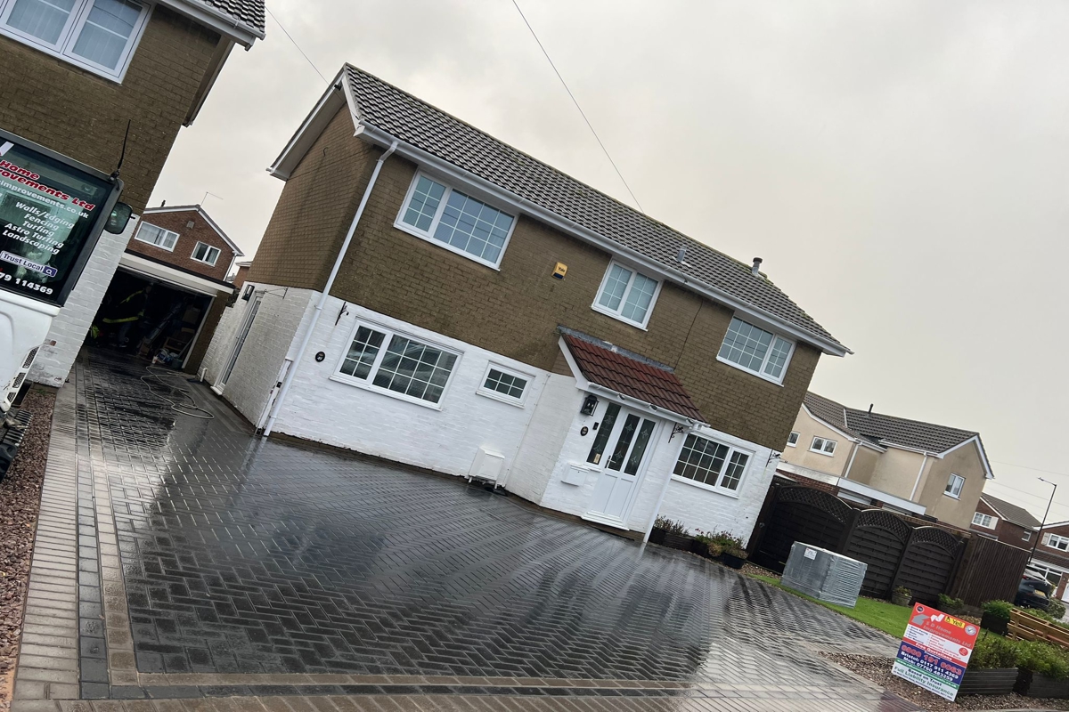 Supplied and installed a sand / grit base for laying paving, Installed paving on top of the sand, The paving used was block paving, Laid the paving in a staggered/random pattern, All open edges of paving set in concrete, Machine vibrated and compacted the paving