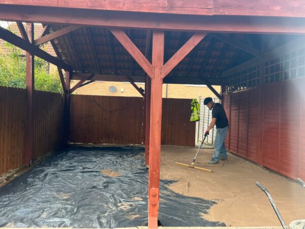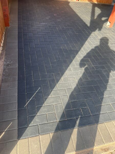 Supplied and installed a sand / grit base for laying paving, Installed paving on top of the sand, Laid the paving in a °90 degree herringbone pattern, The paving used was block paving, All open edges of paving set in concrete, Machine vibrated and compacted the paving